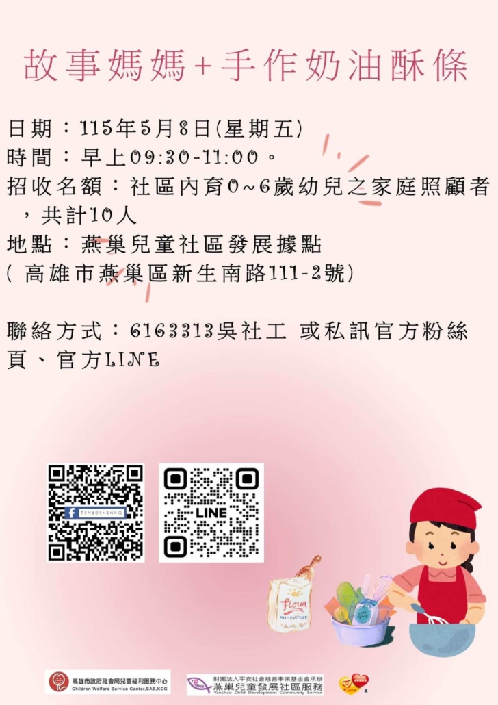 【活動預告】燕巢據點故事媽媽暨奶油酥條手作2026.4.27/在: 最新消息 日期:114年5月8日(五)早上09:30~11:00 對象:0~6歲之兒童及其照顧者,共計10人 地點:燕巢兒童發展社區服務(高雄市燕巢區新生南路111之2號) 報名方式:(07)616-3313或臉書留言、官方LINE私訊報名,確認後會回覆。 /wp-content/uploads/2023/02/logo-0220.png 0 0 jiayuan0114 /wp-content/uploads/2023/02/logo-0220.png jiayuan01142026-04-27 10:48:132026-04-23 13:53:46【活動預告】燕巢據點故事媽媽暨奶油酥條手作