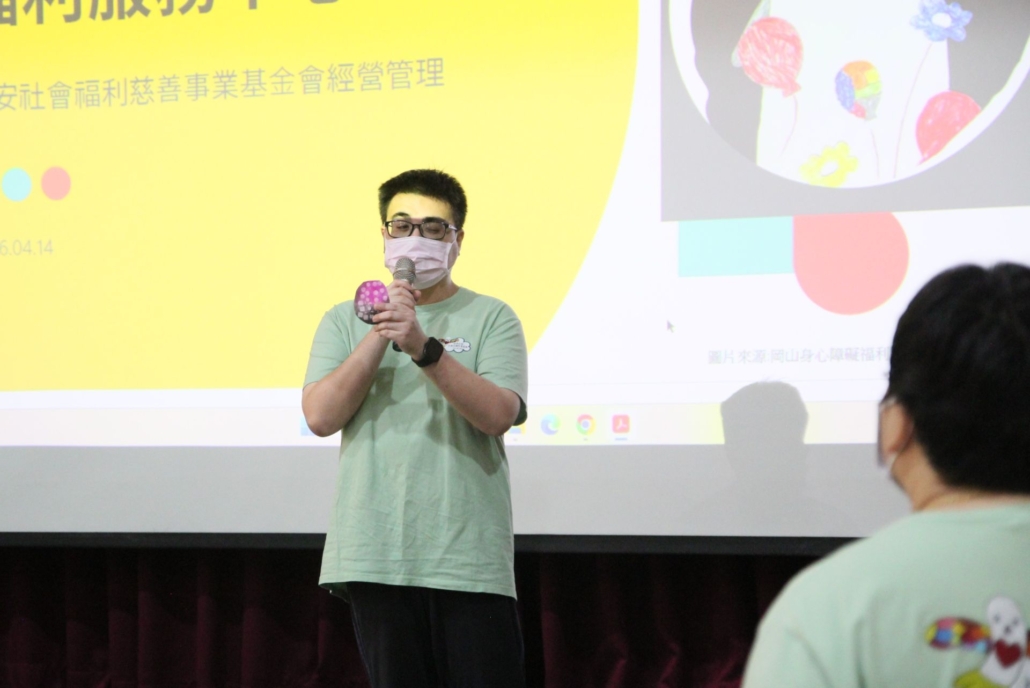 其中,患有智能及視覺障礙的服務使用者小綱,首次參與對外生命教育分享,從準備階段即展現高度投入。他主動構思分享內容、反覆練習,並與同儕討論色彩搭配與設計方式。他表示,看見同儕努力爭取上台機會,讓自己深受鼓舞,也更有勇氣嘗試突破。