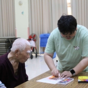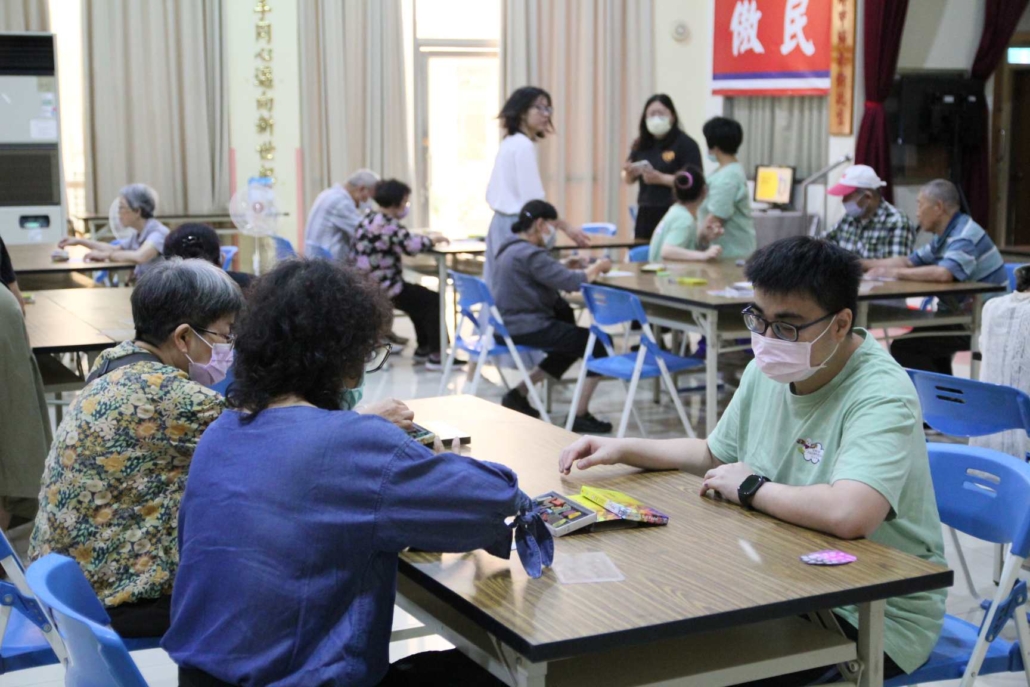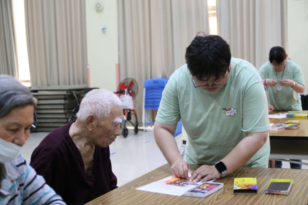 活動當天,服務使用者不再只是參與者,更成為帶領者。他們一邊陪伴長輩創作,一邊耐心引導各個步驟,在互動中建立連結。長輩專注地描繪圖案,偶爾抬頭與身旁的青年交流。