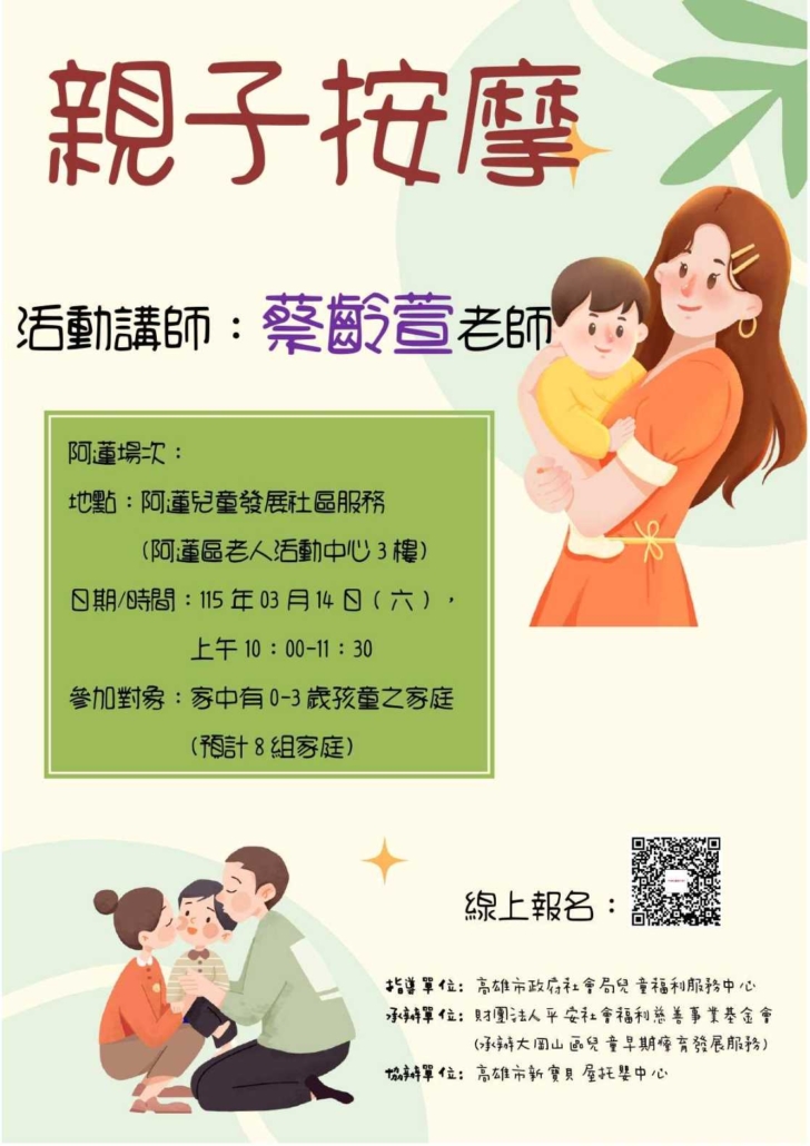 備註:課程名額有限,主辦單位保留審查權,錄取者將最晚於活動前三日收到報名行前通知信。若有課程相關疑問,可以撥打07-6226730分機307 翁社工。