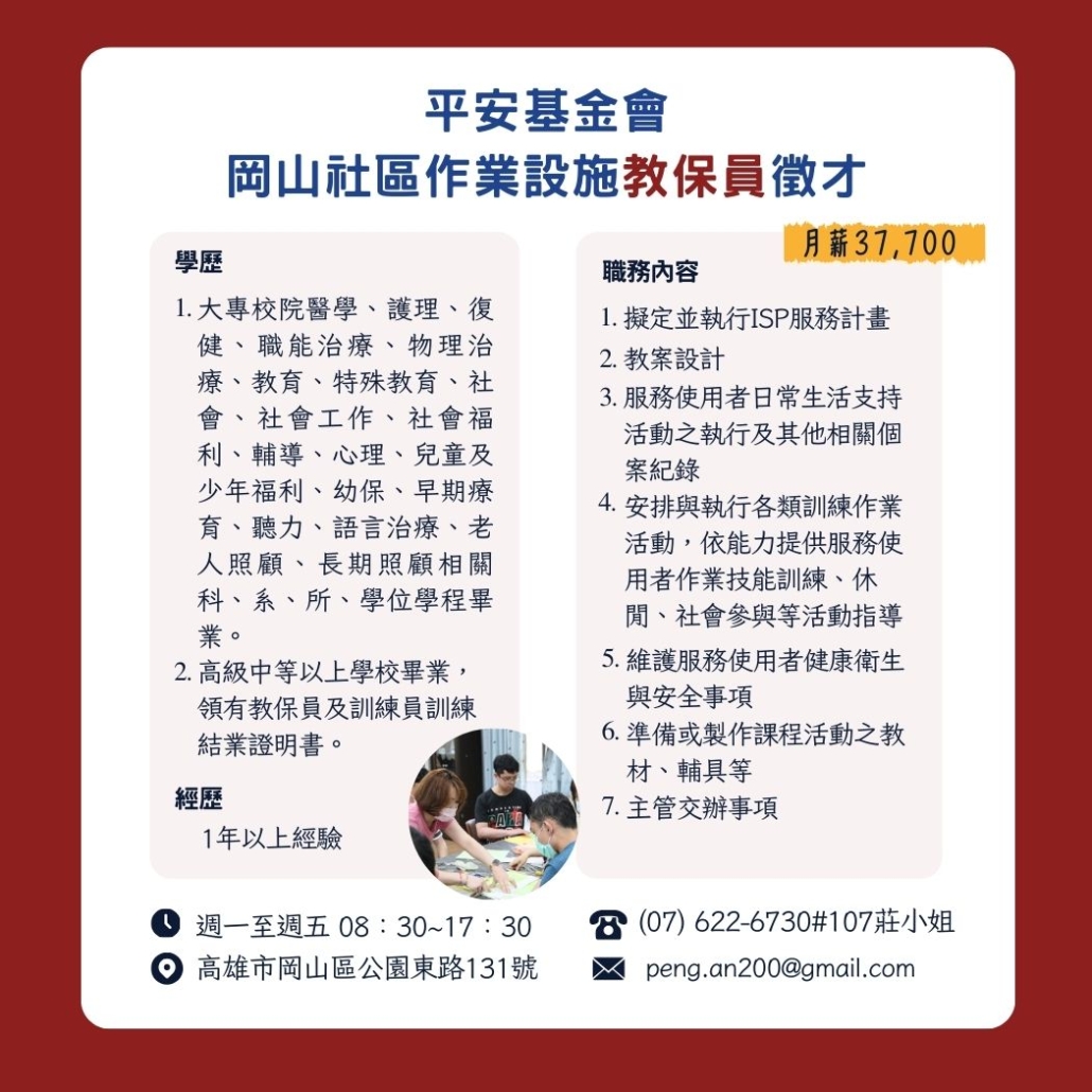 📞 洽詢電話:07-6226730 #107 人事 莊小姐
