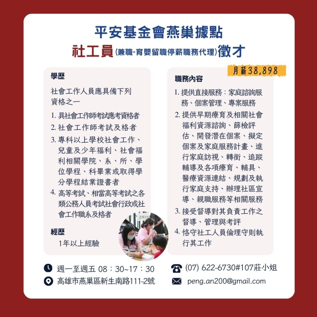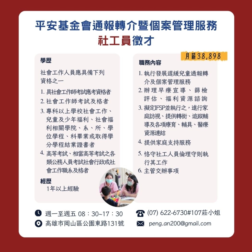 平安基金會、岡山障福中心聯合徵才,現正招募社工、教保員等多項職缺,誠摯邀請對身心障礙服務有熱忱的夥伴加入行列。