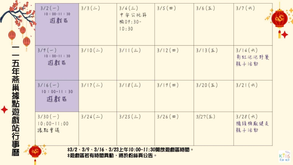 3月份燕巢據點遊戲站時間出爐囉!3/2、3/9、3/16,週一上午10:00-11:30為遊戲區開放時間。目前也有圖書借閱服務,歡迎大家來找我們玩,時間若臨時有異動會於燕巢兒童發展社區服務粉絲專頁公告。有任何問題歡迎來電洽詢:(07)616-3313吳社工。