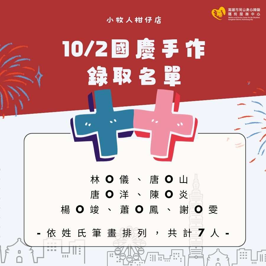 10月份小牧人柑仔店「國慶手作活動」將於10/2(四)舉辦,報名成功的朋友請準時出席。若需請假,或有活動相關問題,請提前致電(07)622-6730 #141張社工,以利名額遞補與活動安排,感謝您的配合!