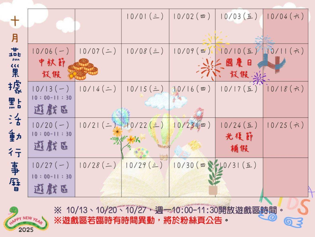 【公告】114年10月份燕巢社區遊戲站開放時間