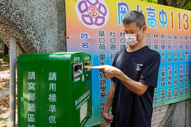 在教保員的陪伴下,小榮(化名)將親手製作的卡片投進郵筒,感謝父親多年來的照顧,也祝福身體欠安的他早日恢復健康。小榮的卡片上寫著「爸爸,父親節快樂」,雖是簡短的一句話,卻是右手張力較大的他耗費許多精力後完成的。