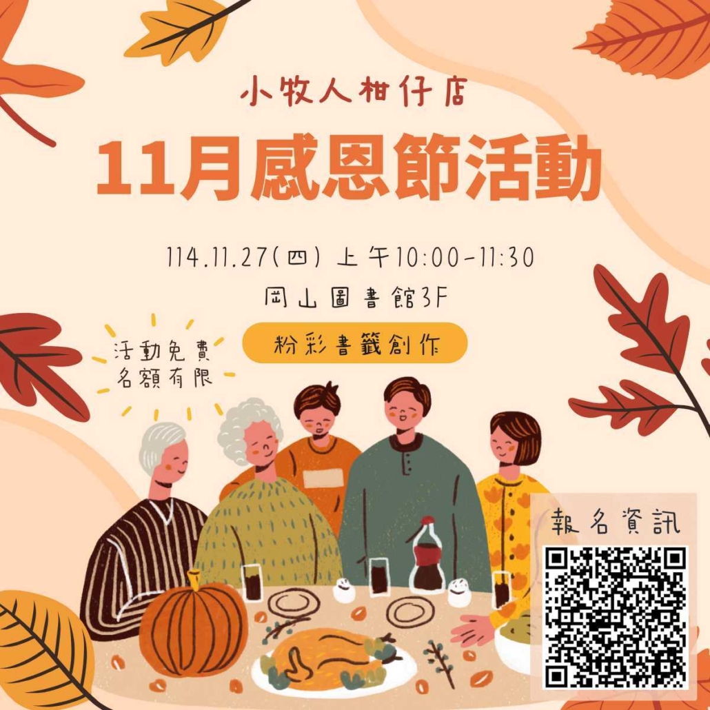 迎接感恩節,11月小牧人柑仔店活動特別將移師到 高雄市立圖書館-岡山分館舉辦,邀請大家一起欣賞畫作,並親手創作個人書籤,細細品味日常,感恩生活中的美好。活動免費,名額有限,歡迎提前報名,如有活動相關問題歡迎來電洽詢(07)622-6730#210歐社工