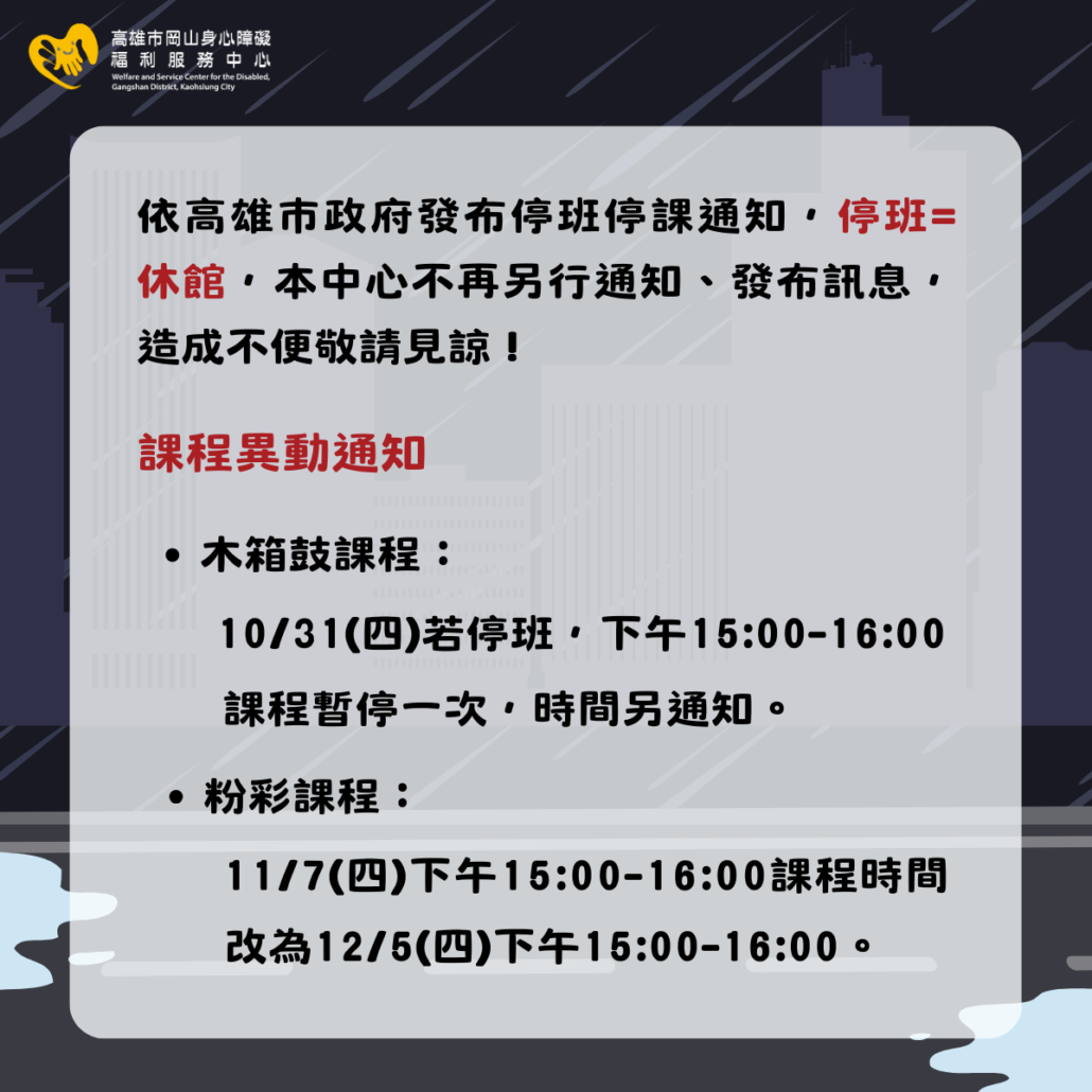 - 木箱鼓:若 10/31 (四) 停班,課程暫停一次,補課時間另行通知。