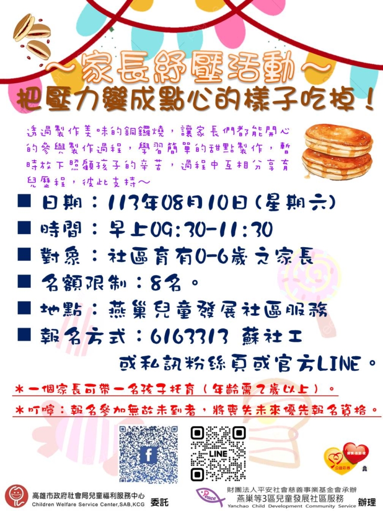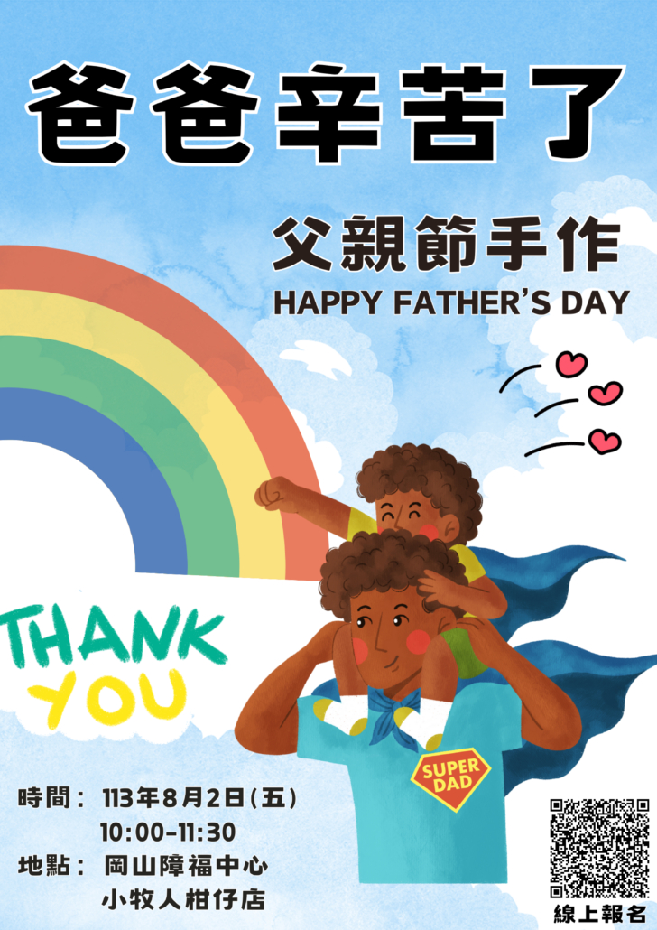 慶祝父親節,每月一次的小牧人柑仔店活動,8月份特別舉辦一場溫馨的手作活動。邀請大朋友、小朋友一起動手製作充滿愛心的爸爸節禮物,一起創造親子美好的回憶,讓父親們感受到最真摯的心意。名額有限,有興趣的朋友請掃下方海報QR Code提前報名,活動問題歡迎撥打(07)622-6730#129蔡社工