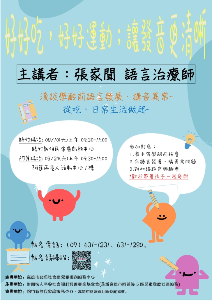 家中有學齡前孩童、有語言構音發展異常問題、對此議題有興趣者歡迎來電報名(07)631-1231或掃QR Code線上報名。