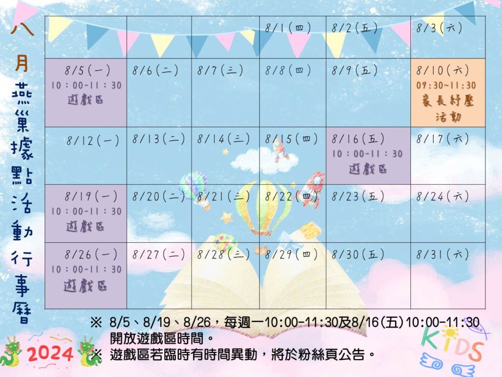 【公告】113年8月份燕巢社區遊戲站開放時間