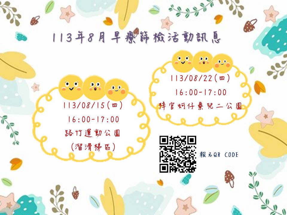 8月份我們即將來去路竹、梓官辦理0~6歲早療遊戲篩檢活動,歡迎大家一起來互動玩遊戲。離開前還可以拿小禮物唷!活動採報名制,因名額有限,請提前來電或是掃QR Code報名。有任何問題歡迎來電洽詢:07-6226730#136佘社工。