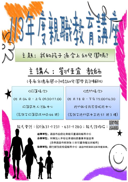 - 報名方式:掃QR Code線上報名或撥打(07)631-1231、(07)631-1280電話報名
