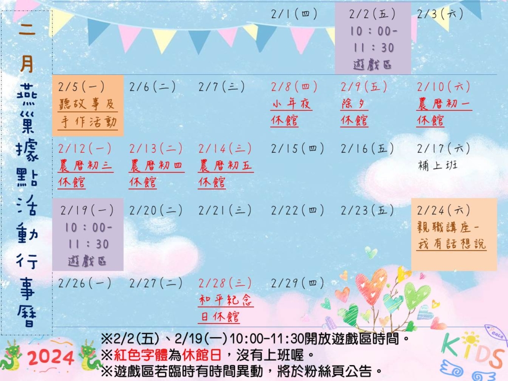 113/2/8(四)-113/2/14(三)為農曆新年連續假期,中心休館七天,2/15(四)開始提供服務,造成不便盡請見諒。113/2/17(六)為農曆新年補班日,中心照常提供服務。