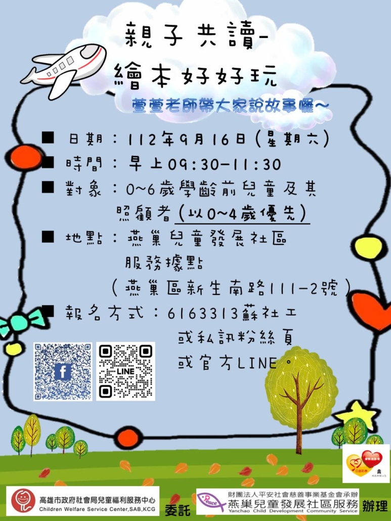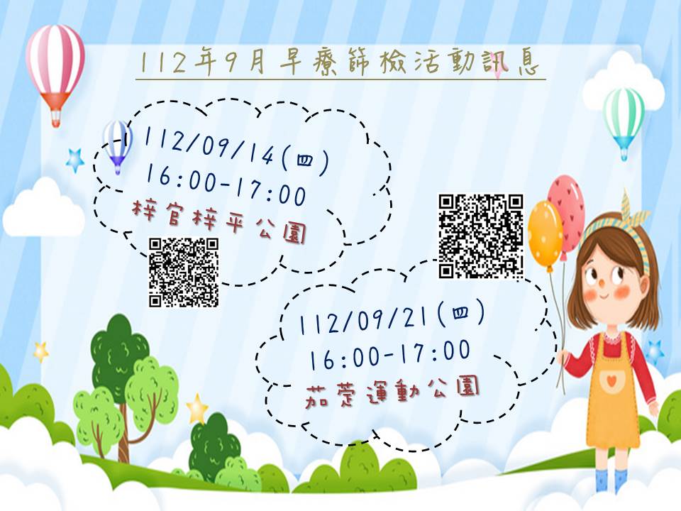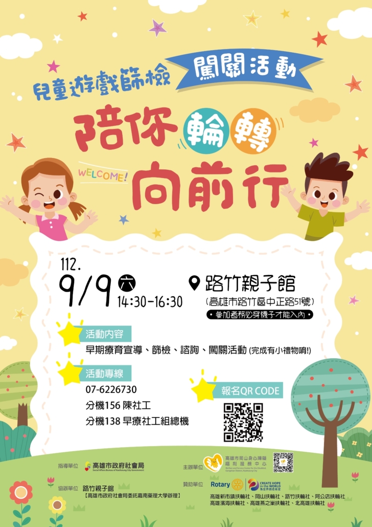 9月份我們即將來去梓官、茄萣辦理0~6歲早療遊戲篩檢活動,歡迎大家踴躍報名,帶孩子與社工姐姐們互動、玩遊戲,離開前還可以拿小禮物唷!活動採報名制,因名額有限,請大家提前來電或是掃者掃QR Code報名,若報名額滿網路表單就會關閉不再接收報名,想要參加者可到現場,將會以現場實際狀況調整,以有報名者為優先或直接來電洽詢。