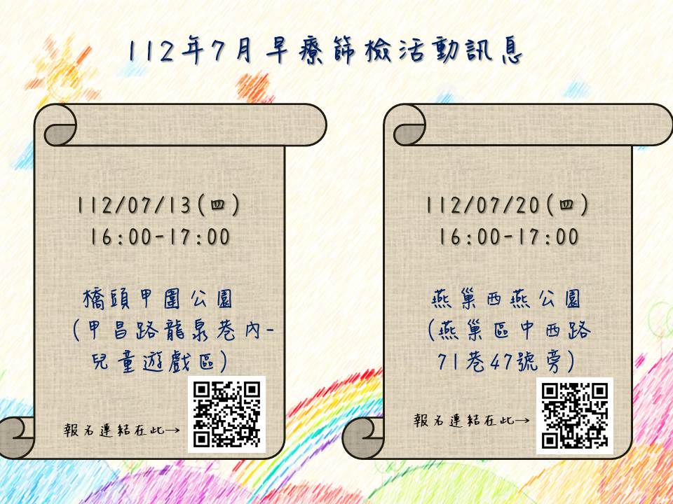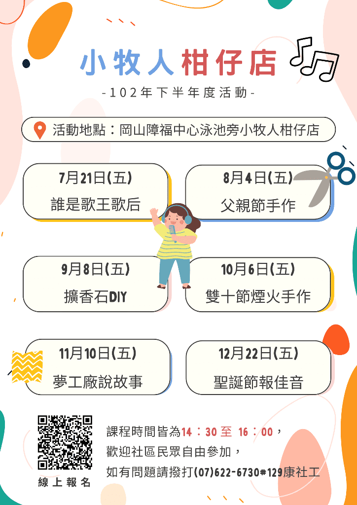 7、8月天氣較不穩定,這個月活動改在室內場地辦理,歡迎大家踴躍報名,離開前還可以拿小禮物唷~因名額有限,活動採報名制(可電話或者掃QR Code報名),若報名額滿,網路表單就會關閉不再受理報名,欲參加者可到現場,將會以現場實際狀況調整,以有報名者為優先或直接來電洽詢。