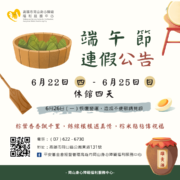 112/6/22(四)-6/25(日)為端午節連續假期,中心休館四天,6/26(一)開始提供服務,造成不便盡請見諒。