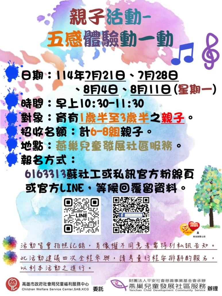 【活動預告】7/21(一)、7/28(一)、8/4(一)、8/11(一)10:30~11:30親子活動-「五感體驗動一動」,地點:燕巢兒童發展社區服務。
