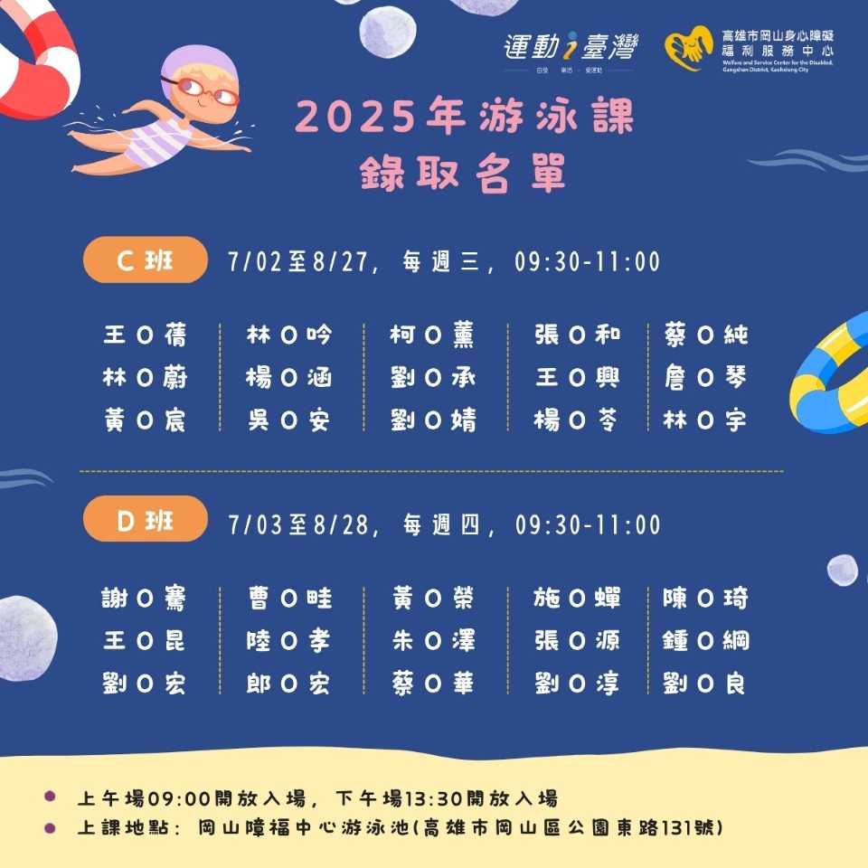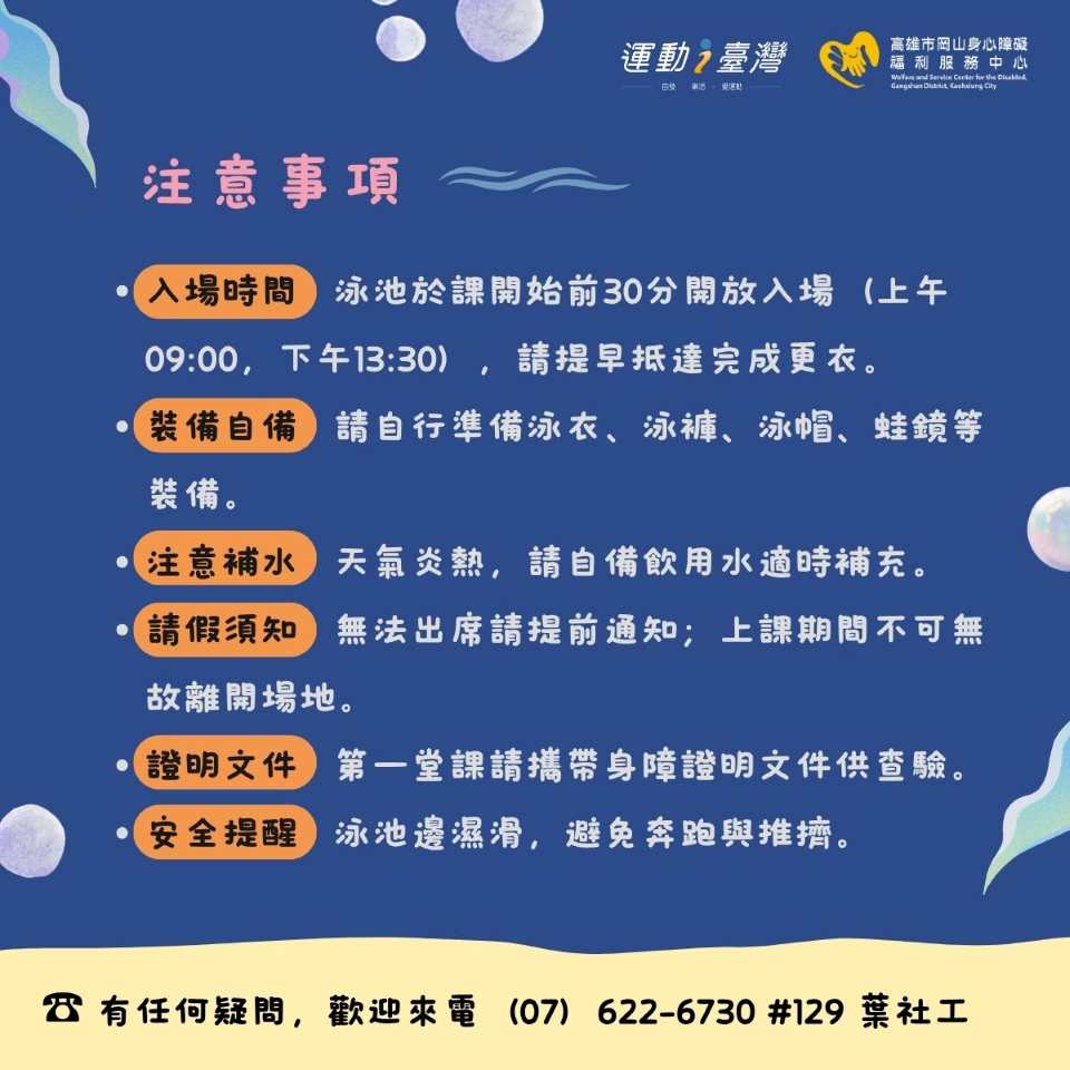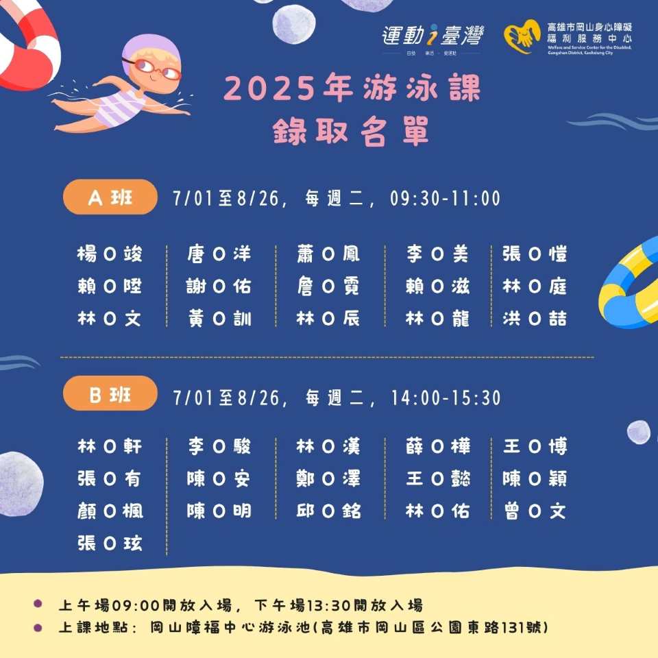 2025年岡山障福中心游泳池將於7/1(二)至8/29(五),每週二至週五 09:30-11:00及14:00-16:00 對外開放,歡迎前往使用。