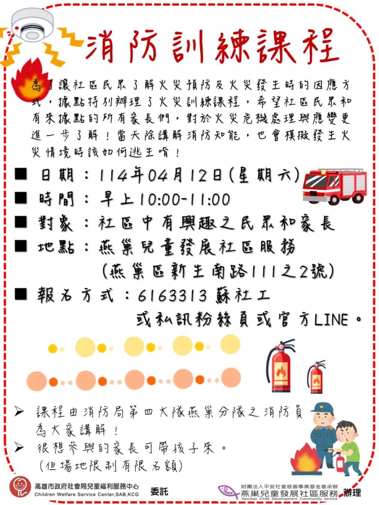課程由消防局第四大隊燕巢分隊之消防員為大家講解,歡迎致電(07)616-3313蘇社工或私訊粉絲頁、官方LINE報名(粉絲頁或官方LINE若無回應需來電確認)