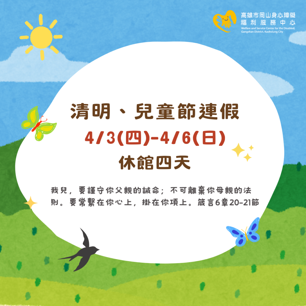 113/4/3(四)-4/6(日)為清明節連續假期,中心休館四日,4/7(一)開始提供服務,造成不便盡請見諒。