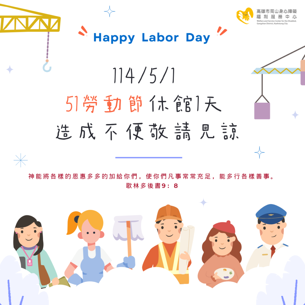 114/5/1(四)為51勞動節連續假期,中心休館1天,造成不便盡請見諒。