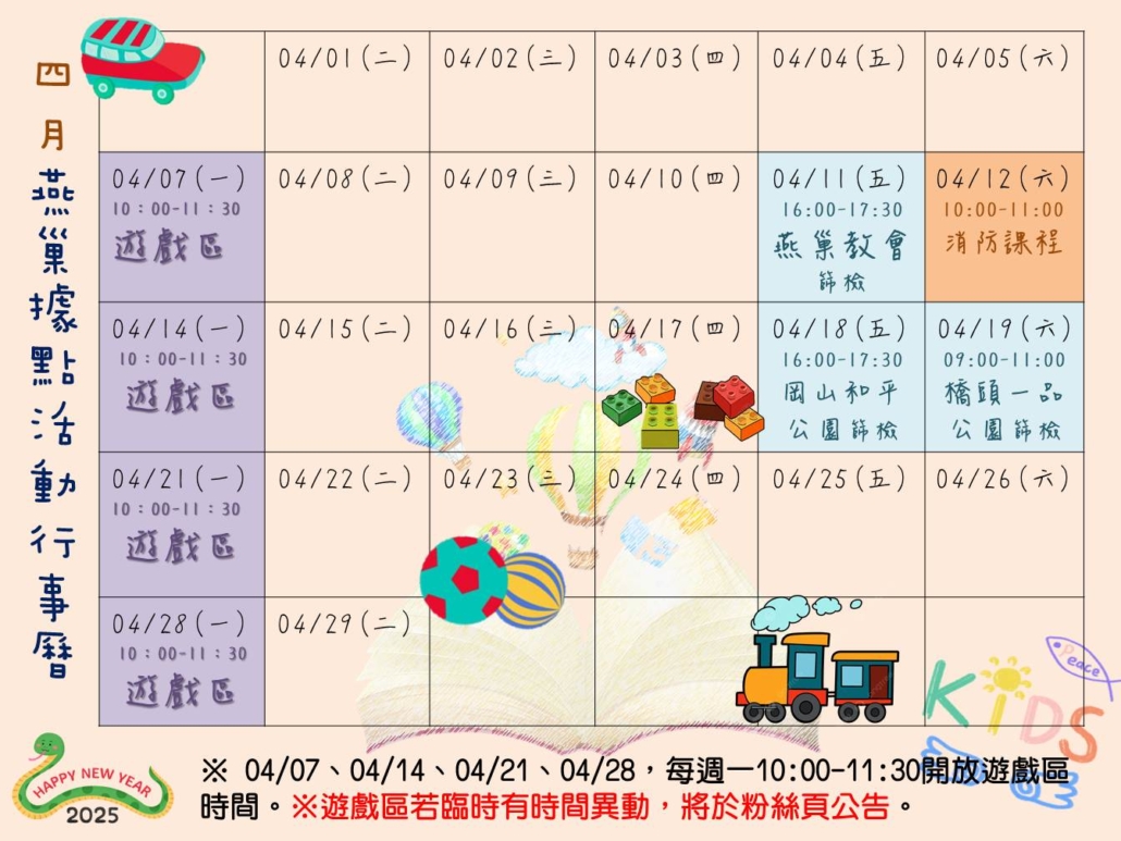 4月份燕巢據點遊戲站時間出爐囉!04/07、04/14、04/21、04/28,每週一早上10:00 – 11:30為遊戲區開放時間,目前也有圖書借閱服務,歡迎大家來找我們玩,時間若臨時有異動會於燕巢兒童發展社區服務公告。有任何問題歡迎來電洽詢:(07)616-3313蘇社工。
