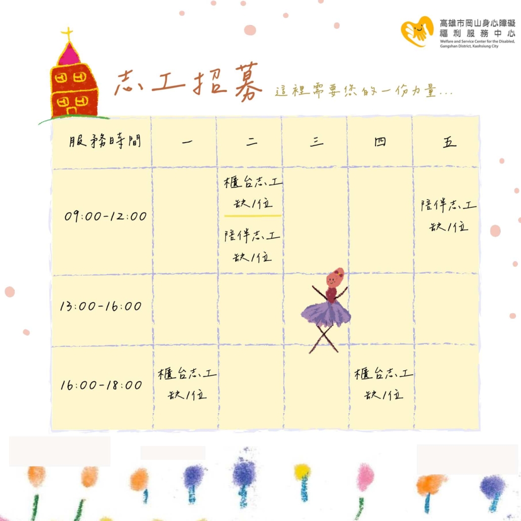 岡山障福中心牧人志工隊招募數名服務台及陪伴志工,歡迎熱心公益的您一起投入行列,服務專線 (07) 622-6730#134 張社工。邀請您轉分享訊息,讓更多熱心的朋友看見,為需要的朋友送上溫暖與支持!