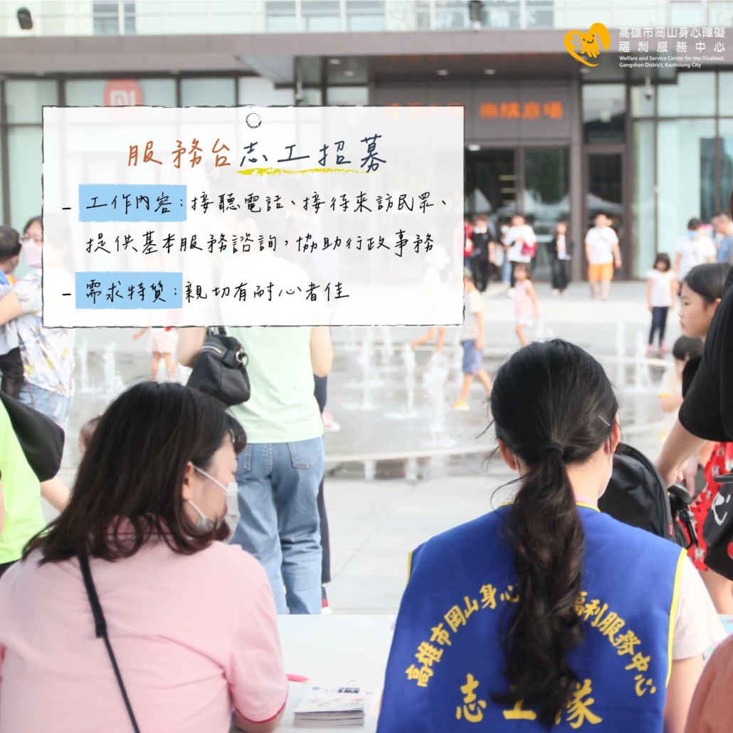 岡山障福中心牧人志工隊招募數名服務台及陪伴志工,歡迎熱心公益的您一起投入行列,服務專線 (07) 622-6730#134 張社工。邀請您轉分享訊息,讓更多熱心的朋友看見,為需要的朋友送上溫暖與支持!