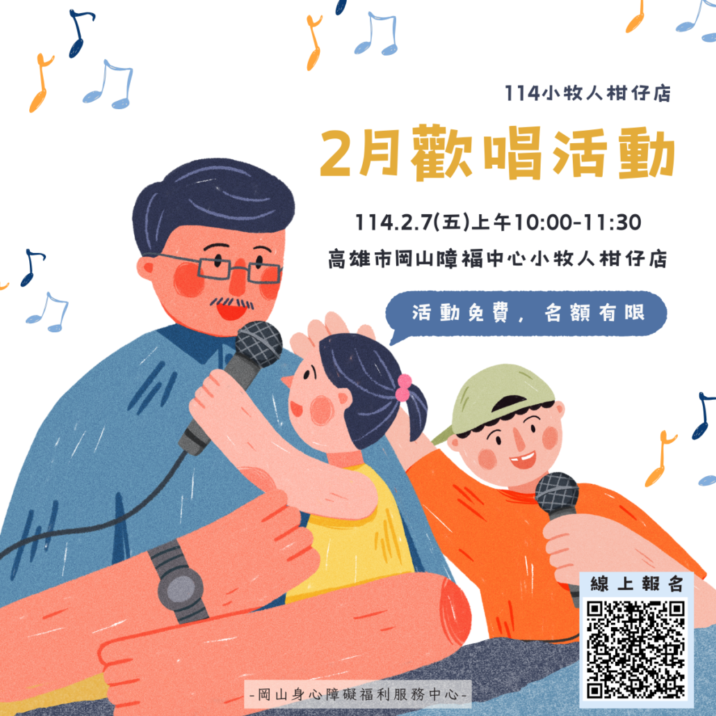 小牧人柑仔店2月份活動,將於2月7日為大家帶來充滿歡樂的歡唱活動,邀請社區民眾一起用歌聲釋放壓力。活動免費,名額有限,有興趣的朋友,快來掃描QR Code或點選下方網址提前報名,與家人、朋友共享這段美好時光。如有任何疑問,歡迎致電(07)622-6730#141張社工。